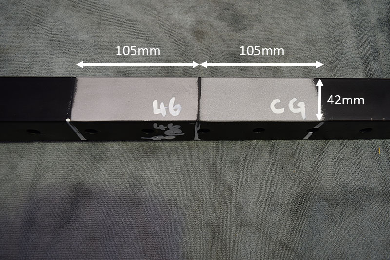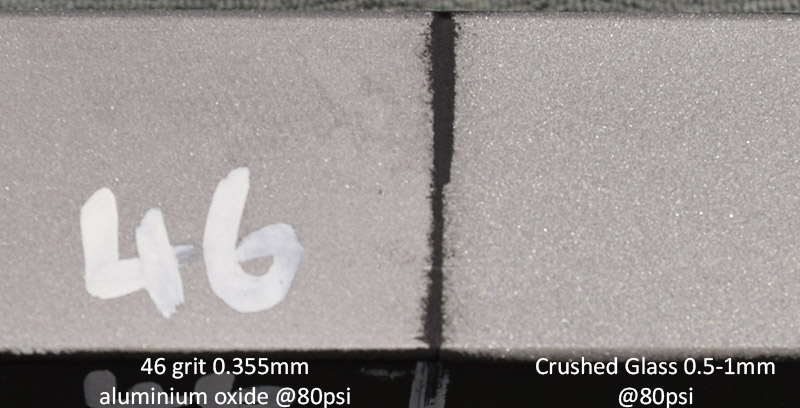 In the meantime, you can click on the photos below to see a comparison between a large 46 grit (β355Β΅) aluminium oxide and an even larger βfine gradeβ (500-1000Β΅) crushed glass. Both sections were blasted with fresh new media at 80psi and took a comparable time (43s for oxide, 47s for crushed glass) to remove the same sized section of powdercoat (105 x 42mm). They both give a matte finish with a good βkeyedβ surface that a fresh coat of paint will adhere to well. Both oxide and glass are available in much smaller sizes for a finer finishes than those achieved here.