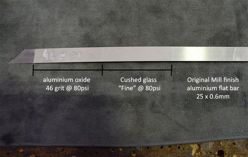 For comparison, we also blasted an scrap piece of aluminium flat bar (25 x 0.6mm thick) to show the effect of relatively large crushed glass and aluminium oxide at relatively high pressure (80psi) on softer material.