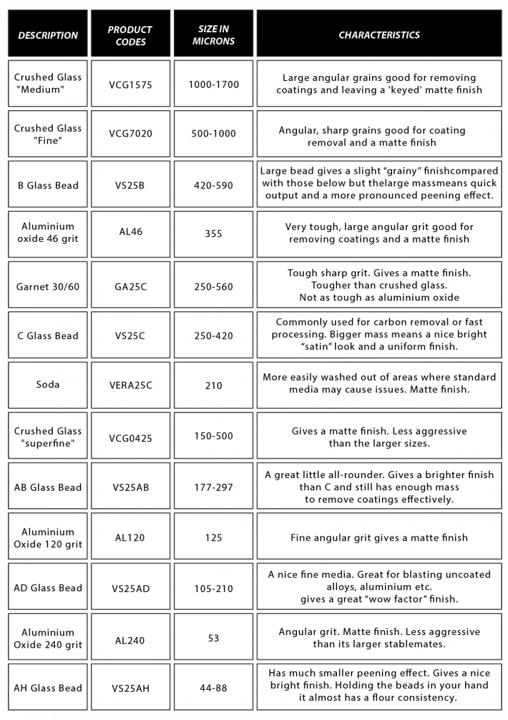 Below is a table showing some of the more common grades of blasting media supplied by Dana-Ridge (other sizes and grades available upon request).