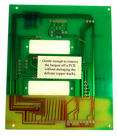 Expensive circuit boards can be repaired and put back into service. The wet blast process is gentle enough to remove the protective lacquer from the copper tracks and circuit board component mounts without damaging the resin base. This allows repairs to be made, circuit board tested, re-lacquered and put back into service
