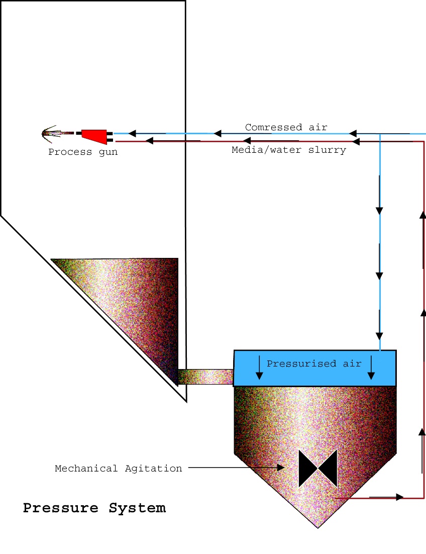 A second system (also popular in dry-blast cabinets) is the pressure pot system. Here the slurry is directed to a pressurised “pot” using a small pump and the air pressure inside the pot provides the force that sends the media to the process gun where it is further accelerated using compressed air.