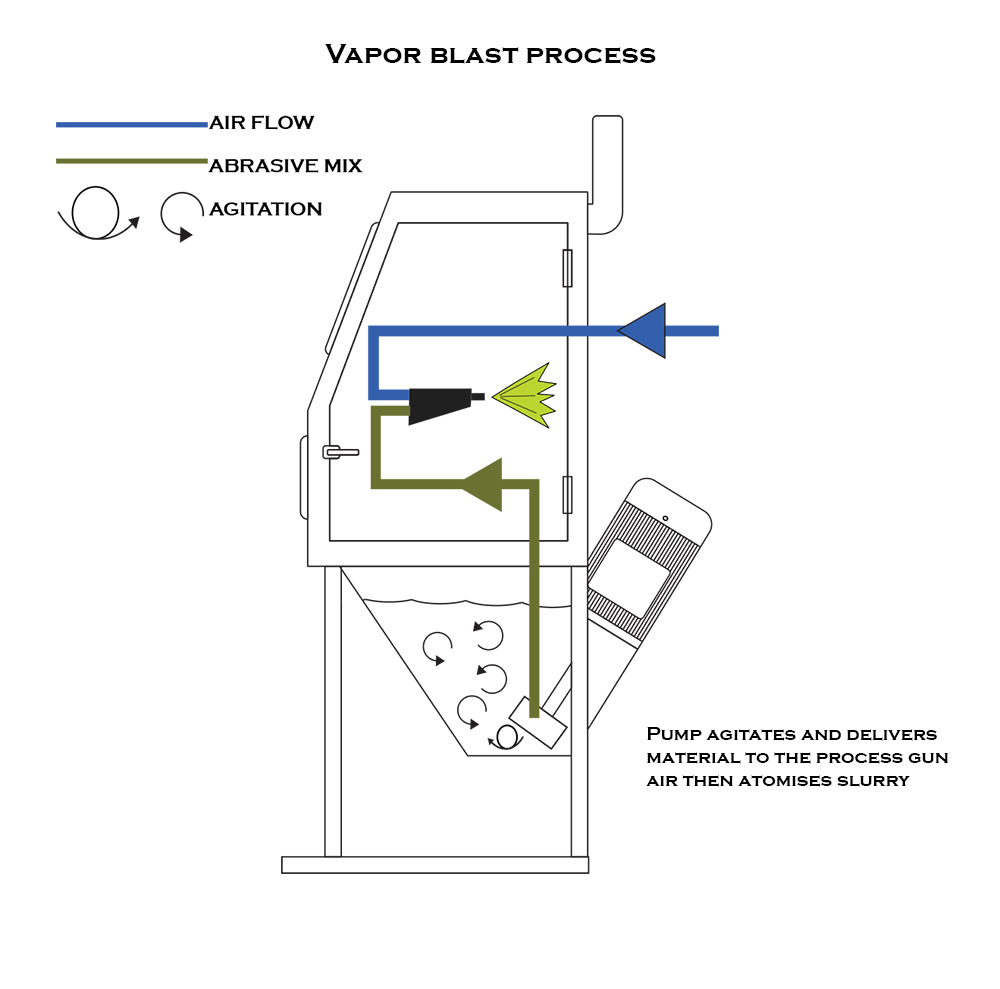 Vapour blasters use a pump that both stirs and sends the media slurry to the process gun. The motor is outside the unit while the pump is inside the sump and samples the agitated slurry.