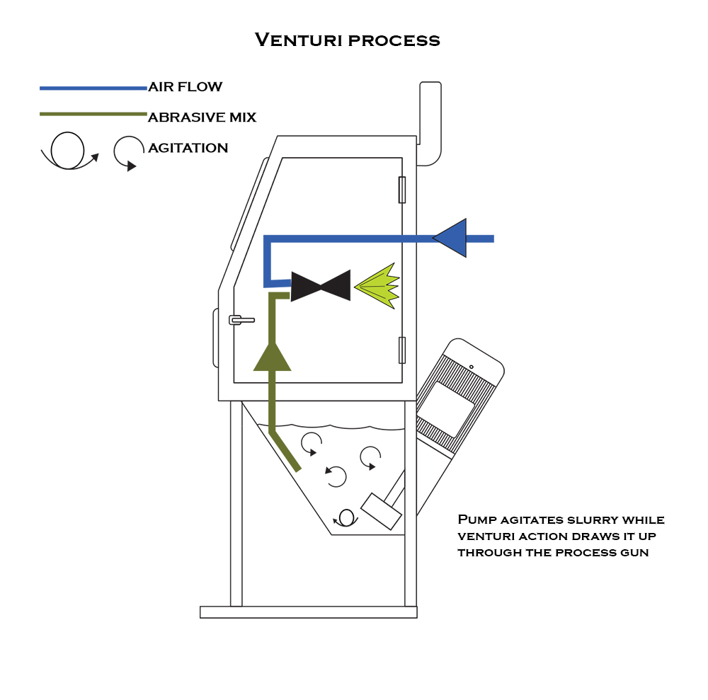 The venturi system is also common on a lot of dry sandblast cabinets and processes but is not very good for a wet setup.