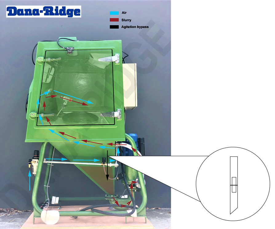 If when blasting you notice that it is taking a long time to process or is not processing at all even though water is coming out of the process gun you may have a blockage in your agitation. Our machines work when there is a good mixture of the slurry to water. This is achieved by splitting the flow between the process gun and the agitation nozzle.