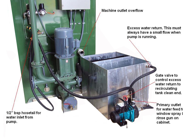 Upon receipt of the machine, you will position it in the most suitable area for you. Consideration will need to be made for the machine height, door opening, closed loop system, if used (access to a suitable drain if not), side-load station (if so equipped) and rear access for future maintenance. Recirculating (closed loop) tanks are best positioned directly under the machine overflow but short lengths of PVC pipe with as few bends as possible mean the tank can be positioned somewhat clear of the machine.