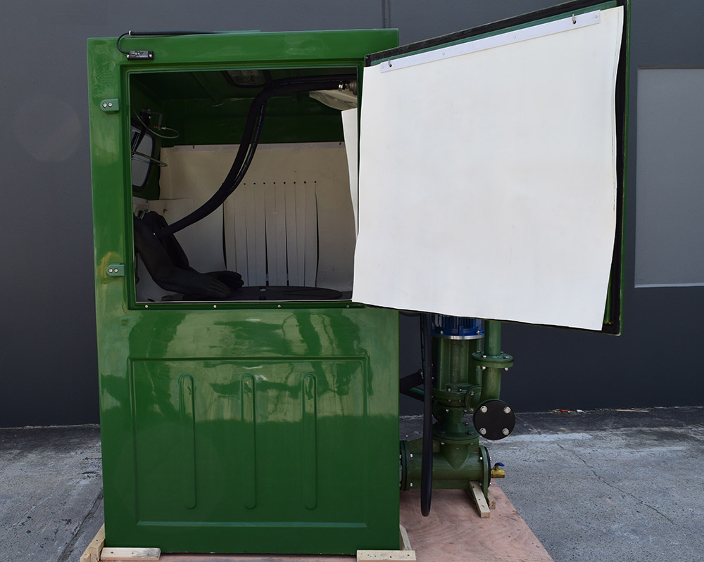 This fibreglass housing bolts to the side of either the COMET or the MARS to extend the width of the unit by 400mm. White polymer blast curtains serve several functions including light reflectivity, protection of the fibreglass from the blast stream and redirection of media back to the pump via the angled base and slats covering the cavity inside. The unit can be fitted to a new machine or as an after-market option for an existing Dana-Ridge wetblast unit.