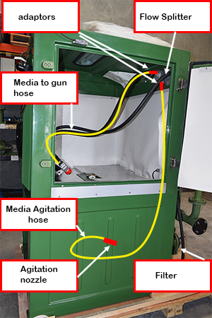 If when blasting you notice that it is taking a long time to process or is not processing at all even though water is coming out of the process gun you may have a blockage in your agitation. Our machines work when there is a good mixture of the slurry to water. This is achieved by splitting the flow between the process gun and the agitation nozzle